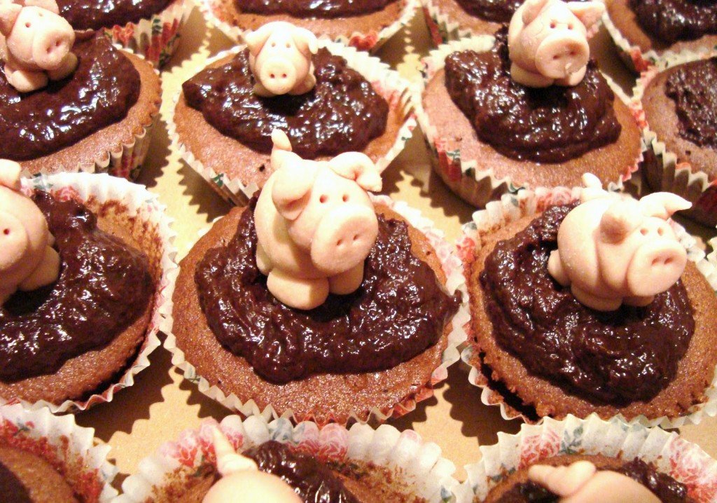 Taking these memories as inspiration I decided on chocolate cupcakes with a ganache icing featuring mini pink pigs wallowing in the icing. Pigs stuck in the mud if you like. Here’s how. NB: these aren’t hard but you do need to sacrifice an evening.