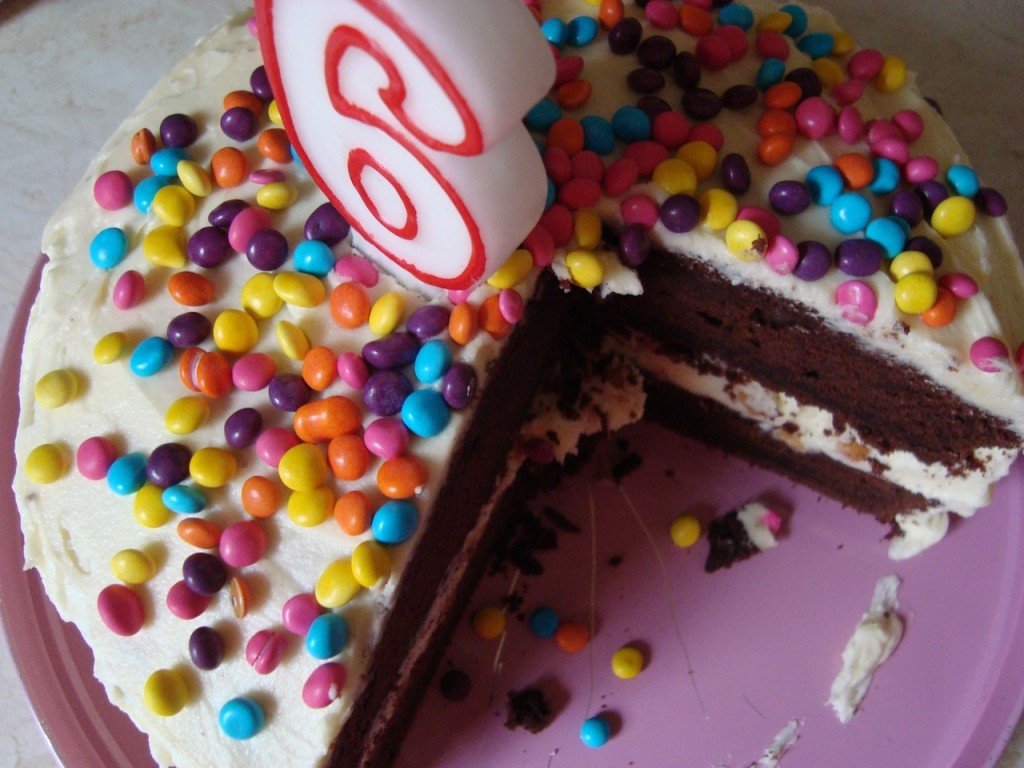 Finish the cake using buttercream and fudge pieces to fill, then the rest of the buttercream to ice the sides and the top. I use a regular butter spreading knife rather than a palate knife. Less unwieldy in my book. Decorate with anything that takes your fancy. Baa Baa, AKA Grandad really likes multi coloured chocolate beans. Or at least he does now.