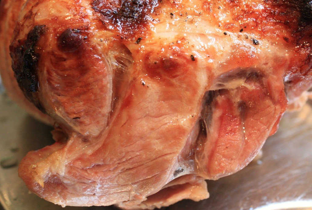 Leave for 30 minutes to come to room temperature and in the meantime calculate your roasting time. You need to roast for 30 mins per 500g of meat plus an extra 30 mins. To roast, place in a preheated oven at Gas 7/220C for the first 30 minutes then turn down to Gas 4/180C for the rest of the cooking time. Every 40 minutes or so I drained some water away from the roasting tin. (The brined pork will release water as it roasts. Pouring it away ensures it roasts rather than boils.)