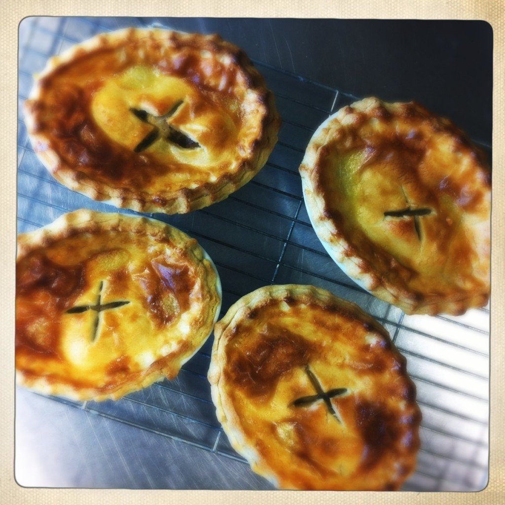 Meanwhile flour the work surface and roll the pastry out using a forwards motion rather than a backwards and forwards motion. Turn the pastry 90 degrees after each roll until he pastry is about 3mm thick. Spoon the filling into your pie dishes then paint the edges of the dishes with egg wash. Cut strips to fit onto the edges, pressing down as you fix them, then egg wash them too. Then cut a lid for the pie and place over the top. Press onto the edges gently, fixing the pastry to the previously egg washed pastry, being careful not to stretch the pastry as you do this. Cut the edges of the pastry just a little larger than the edge of the dish and use a spoon end of fork to make a pretty pattern around the edge. Place back in the fridge for 20 minutes to chill the pastry and stop it shriking too much in the oven. Egg wash the whole pie lid then cut a cross in the middle of each pie and bake in a preheated oven for 25 minutes at 200C/gas mark 6.